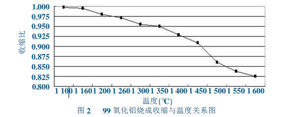 99氧化鋁陶瓷配方中主要添加少量的高嶺土、輕質(zhì)碳酸鎂、煅燒滑石等,添加量很低,在燒成過程中礦物的分解和失水等影響因素可以忽略不計。如圖2所示,為99氧化鋁陶瓷燒成收縮與溫度關(guān)系曲線,每個溫度點(diǎn)樣品保溫2h,根據(jù)曲線,99氧化鋁的燒成可以分為以下幾個階段。