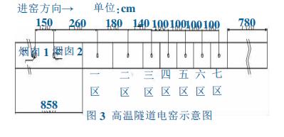 通過對99氧化鋁陶瓷燒成過程分析,主要對階段進(jìn)行重點(diǎn)調(diào)整,其余階段燒成狀況作相應(yīng)的調(diào)整。由于隧道窯為連續(xù)式窯爐,其溫度曲線的調(diào)整是通過調(diào)整一區(qū)溫度、煙囪開關(guān)程度、窯車裝載量等來控制。圖3為高溫隧道電窯的示意圖,窯車推進(jìn)速度為20cm/h。