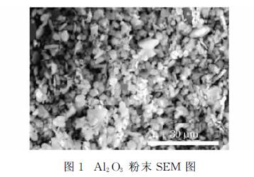 實(shí)驗(yàn)選用ALMATIS公司生產(chǎn)的CT3000SG 級氧化鋁 粉末,化學(xué)組分見表1。用掃描電子顯微鏡 (SEM)觀察,可見粉末呈不規(guī)則片狀結(jié)構(gòu),如圖1所示。使用美國貝克曼庫爾特LS13320型激光粒度分析 儀測量氧化鋁 粉末顆粒尺寸,平均粒徑為0.62μm。