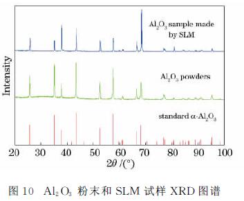 氧化鋁 陶瓷試樣與原始氧化鋁 粉末的XRD圖譜如圖10所示,其中2θ為衍射角。氧化鋁 粉末主要由 α-氧化鋁 相組成,SLM 成形試樣中保留了原始粉末中的晶相。