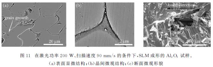圖11(a)、(b)分別為試樣頂面的顯微結(jié)構(gòu)和晶間微觀結(jié)構(gòu)。從圖中可以看出,晶粒組織均勻,三晶界交 角為120°,晶粒間界面的結(jié)合不是很緊密。激光能量高,形成了高溫度場,氧化鋁 晶粒界面間的活度較大,晶 粒與晶粒界面間產(chǎn)生液相,減弱了晶粒間的束縛,氧化鋁 晶粒按各向異性的方式自由長大。圖11(c)為高能激光沖擊后開裂試樣斷面微觀形貌,從圖中可以發(fā)現(xiàn),晶粒斷裂形式以沿晶斷裂為主,斷面不平整;試樣斷面 孔隙較少,致密化程度較高;由于生長動力足夠,晶粒呈柱狀,這種結(jié)構(gòu)具有增韌效果。