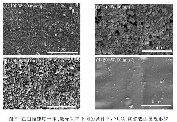 在掃描速度一定、激光功率不同的條件下,氧化鋁 漿料試樣表面形貌如圖7所示。由圖可以看出,當(dāng)掃 描速度恒為90mm/s,激光功率為100,120,140W 時,試樣存在裂紋且表面不平整,局部出現(xiàn)了凸起;隨著 激光功率的增加,表面平整性不斷提高,但裂紋依然存在;當(dāng)激光功率提高到200W 時,試樣表面沒有明顯 的氣孔和裂紋,形成了連續(xù)的掃描軌跡,相鄰掃描線間結(jié)合質(zhì)量較好。