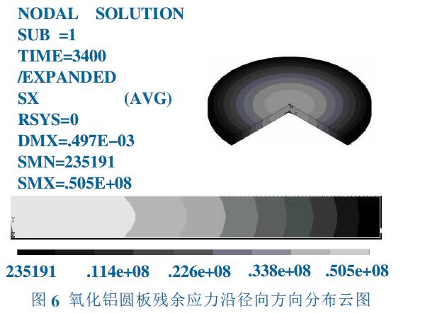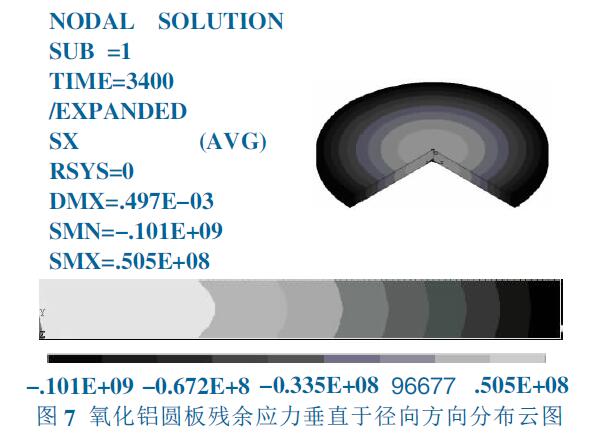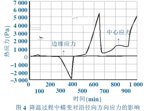 在快速降溫階段,不考慮蠕變的影響,在氧化鋁圓板徑向方向出現(xiàn)較大的溫度梯度見圖2,將圓板結(jié) 構(gòu)分析與溫度分析進(jìn)行耦合計(jì)算見圖3。這種熱應(yīng)力為瞬態(tài)熱應(yīng)力,隨著溫度梯度的降低而逐漸減小。 對(duì)于工業(yè)大尺寸陶瓷的燒結(jié), 燒成溫度遠(yuǎn)高于 蠕變起始溫度, 在快速降溫階段需考慮蠕變對(duì)溫度 場和應(yīng)力場的影響。將蠕變與熱應(yīng)力進(jìn)行高溫段耦 合分析,見圖4。