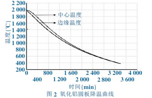 為提高計(jì)算精度, 采用平面旋轉(zhuǎn)對(duì)稱模型代替 圓板,設(shè)置平面尺寸為0.18×0.02m(半徑0.18m,厚 度0.02m),傳熱分析建立在天然氣梭式窯溫度場內(nèi), 為提高計(jì)算精度, 對(duì)于單個(gè)板忽略輻射和熱傳導(dǎo)散 熱對(duì)分析的影響,只考慮對(duì)流換熱的影響,對(duì)流換熱 系數(shù)(受限弱對(duì)流換熱)設(shè)定為固定值10W/(m2·k)。 梭式窯降溫曲線采用方程擬合,見方程(3)。