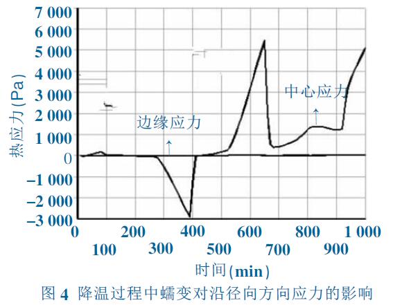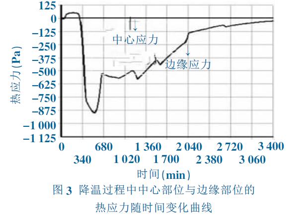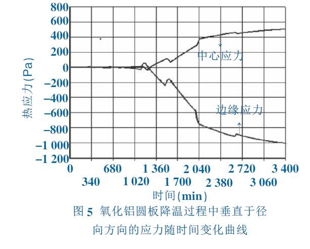 圖4 和圖5 為降溫過程中中心部位和邊緣部位 的應(yīng)力隨時(shí)間變化,在勻速降溫初期,中心與邊緣存 在較大的溫度梯度(>100℃,見圖5),但由于高溫蠕 變?cè)斐蓱?yīng)力馳豫, 圓板在蠕變范圍內(nèi)沒有出現(xiàn)較大 應(yīng)力σ=σ0≈0。隨著勻速降溫時(shí)間增加,內(nèi)外溫度梯 度逐漸降低,即內(nèi)部溫度變化量Tin> Tout,因而體積收縮Vin>Vout,在熱膨脹系數(shù)作用下,內(nèi)部收縮遠(yuǎn)大于 外部收縮βin>βout,從而產(chǎn)生較大的熱應(yīng)力σ=E(βin- βout)。由于氧化鋁蠕變量與溫度成指數(shù)關(guān)系,對(duì)溫度 變化很為敏感,低溫(<1 500K)時(shí)幾乎沒有蠕變的產(chǎn) 生,不能消除降溫段溫度梯度減小而產(chǎn)生的熱應(yīng)力。 從而使熱應(yīng)力隨溫度梯度降低而逐漸增大。當(dāng)內(nèi)外 溫度趨于一致時(shí), 應(yīng)力達(dá)到較大值σt=σ0+E (βin- βout),導(dǎo)致燒成后圓板內(nèi)部存在較大的殘余應(yīng)力。