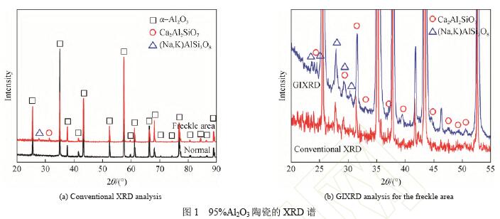 采用Bruker D8 Advance 型X 射線衍射儀對氧化鋁陶瓷正常表面及暗斑區(qū)進行常規(guī)XRD 和掠入射XRD 物相分析。兩者均采用Cu Kα 輻射,加速電 壓40 kV,電流40 mA。掠入射XRD 分析為連續(xù)掃 描模式,入射角度為1.7o,掃描步長0.04o,掃描速 率0.24(o)/min。采用美國FEI公司Quanta 250FEG 場發(fā)射SEM 觀察陶瓷表面的微觀形貌,采用SEM 配備的X 射線能譜儀對表面進行成分分析,工作電 壓20kV。陶瓷樣品在掃描電鏡觀察與分析前進行 噴金處理,噴金時間10 min。采用德國ION TOF 公 司TOF-SIMS 5 質(zhì)譜儀對樣品進行二次離子質(zhì)譜分析。為消除試樣形貌等因素對各離子強度的影響, 對同一個試樣的正常表面和暗斑區(qū)分別進行了相同 時間的離子清洗,并以Al+峰強度為基準(zhǔn),對各離子譜峰的計數(shù)值進行歸一化處理,從而獲得各離子 的相對強度。
