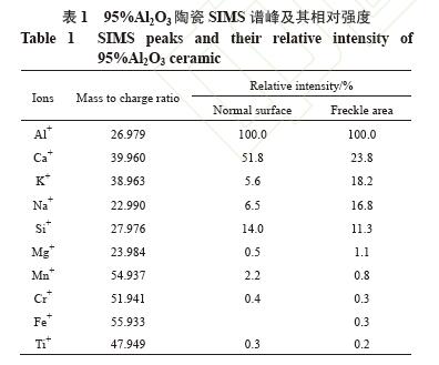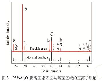 圖3 為95%氧化鋁陶瓷表面正常區(qū)域與暗斑區(qū) 域的正離子質(zhì)譜。可見,95%氧化鋁陶瓷的主要成分 包括Al、Ca、Si、K、Na 以及處于負(fù)離子狀態(tài)的O 元素。對于試樣正常表面,各正離子峰按相對強度 大小分別為Al+、Ca+、Si+、Na+和K+;而對于暗斑 區(qū)域,各正離子峰按相對強度高低分別為Al+、Ca+、 K+、Na+和Si+,即暗斑區(qū)K+和Na+含量明顯增加, Si+和Ca+含量減少。